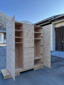 Schrank „Capricorn“ 3-türig aus Arvenholz massiv. Innen verstellbare Tablare und Kleiderstange.